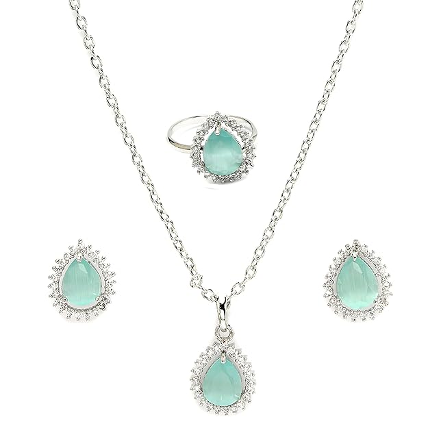 Peora Gold Plated Cubic Zirconia Studded Pendant Chain Drop Earrings & Finger Ring Embellished Jewellery Set for Women